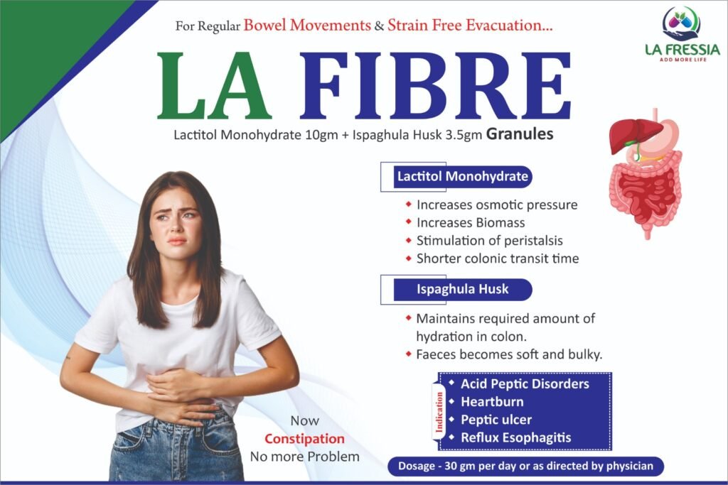 LA FIBRE is a therapeutic dietary fiber supplement designed to relieve constipation and support digestive health. It combines the osmotic laxative action of Lactitol Monohydrate with the hydrating and bulking benefits of Ispaghula Husk, promoting smooth, regular bowel movements and easing gastrointestinal discomfort.
