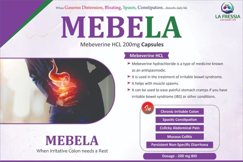MEBELA contains Mebeverine Hydrochloride, a direct-acting smooth muscle relaxant or antispasmodic agent used in the symptomatic treatment of irritable bowel syndrome (IBS) and related gastrointestinal conditions. It provides relief from abdominal cramps, bloating, and spastic constipation without affecting normal gut motility.