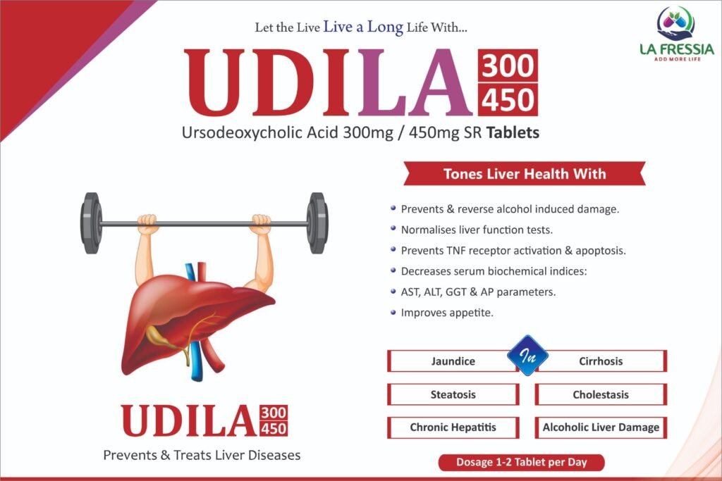 UDILA 300 / 450 is a liver-supportive medication containing Ursodeoxycholic Acid, a bile acid used to treat a variety of liver conditions. It helps improve bile flow, reduce liver enzyme levels, and protect the liver from damage caused by alcohol, bile duct issues, and fatty liver disease.